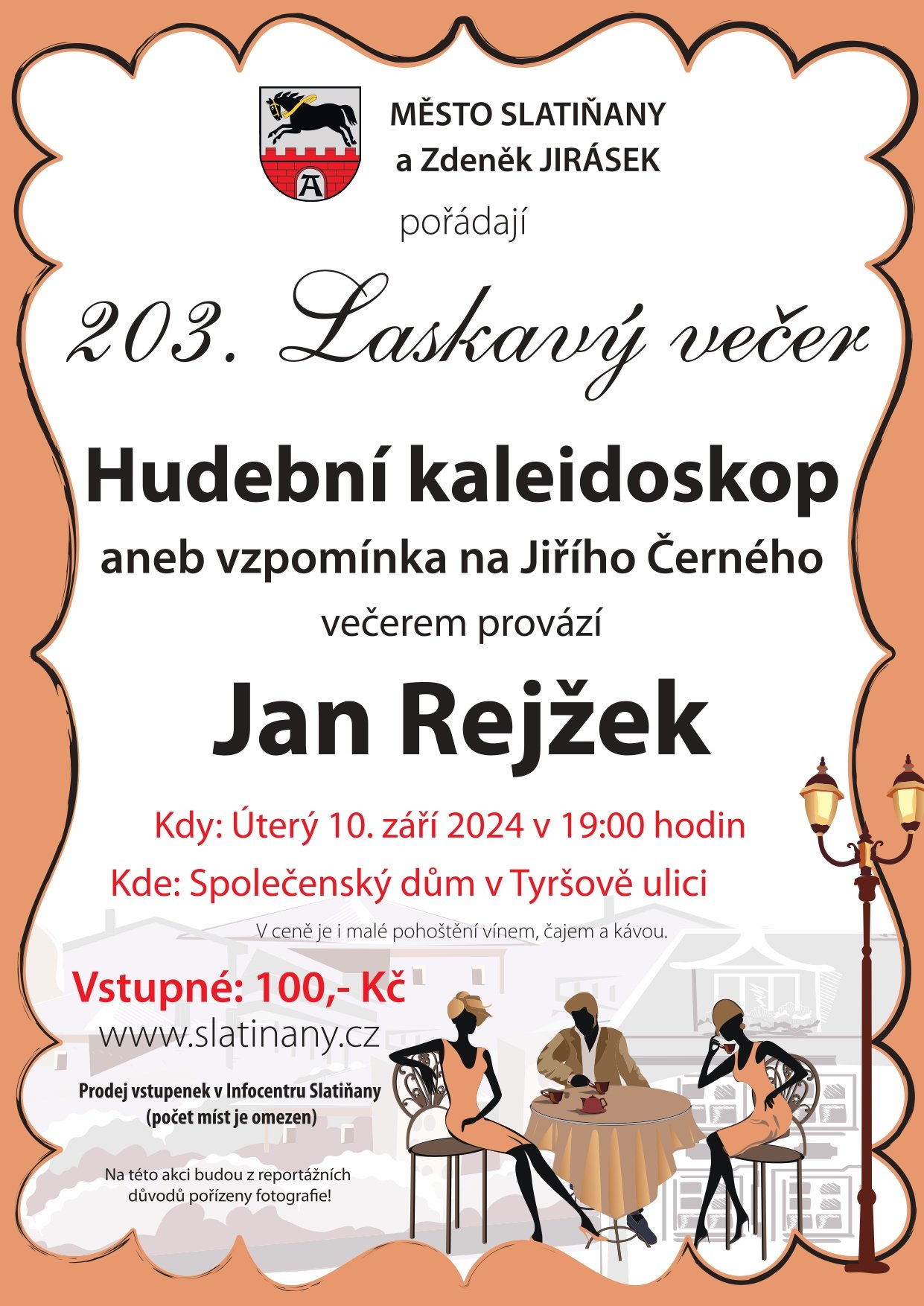 Město Slatiňany a Zdeněk Jirásek vás srdečně zvou na 203. Laskavý večer s podtitulem "Hudební kaleidoskop aneb vzpomínka na Jiřího Černého". Večerem vás provede známý hudební publicista Jan Rejžek, který nám připomene odkaz Jiřího Černého prostřednictvím výběru nezapomenutelných hudebních skvostů.