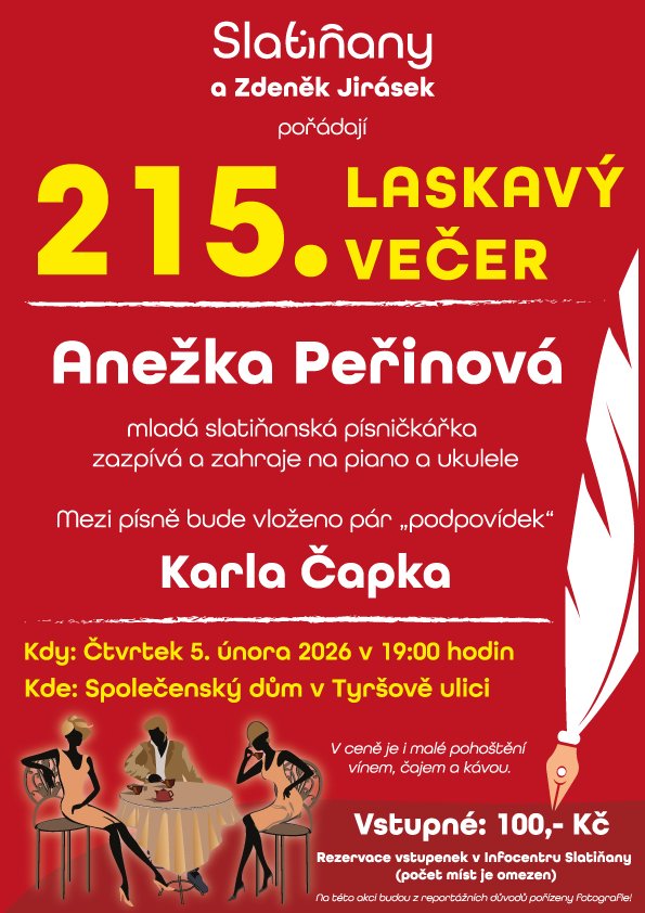 Město Slatiňany a Zdeněk Jirásek vás srdečně zvou na další Laskavý večer, tentokrát s mladou slatiňanskou písničkářkou Anežkou Peřinovou.