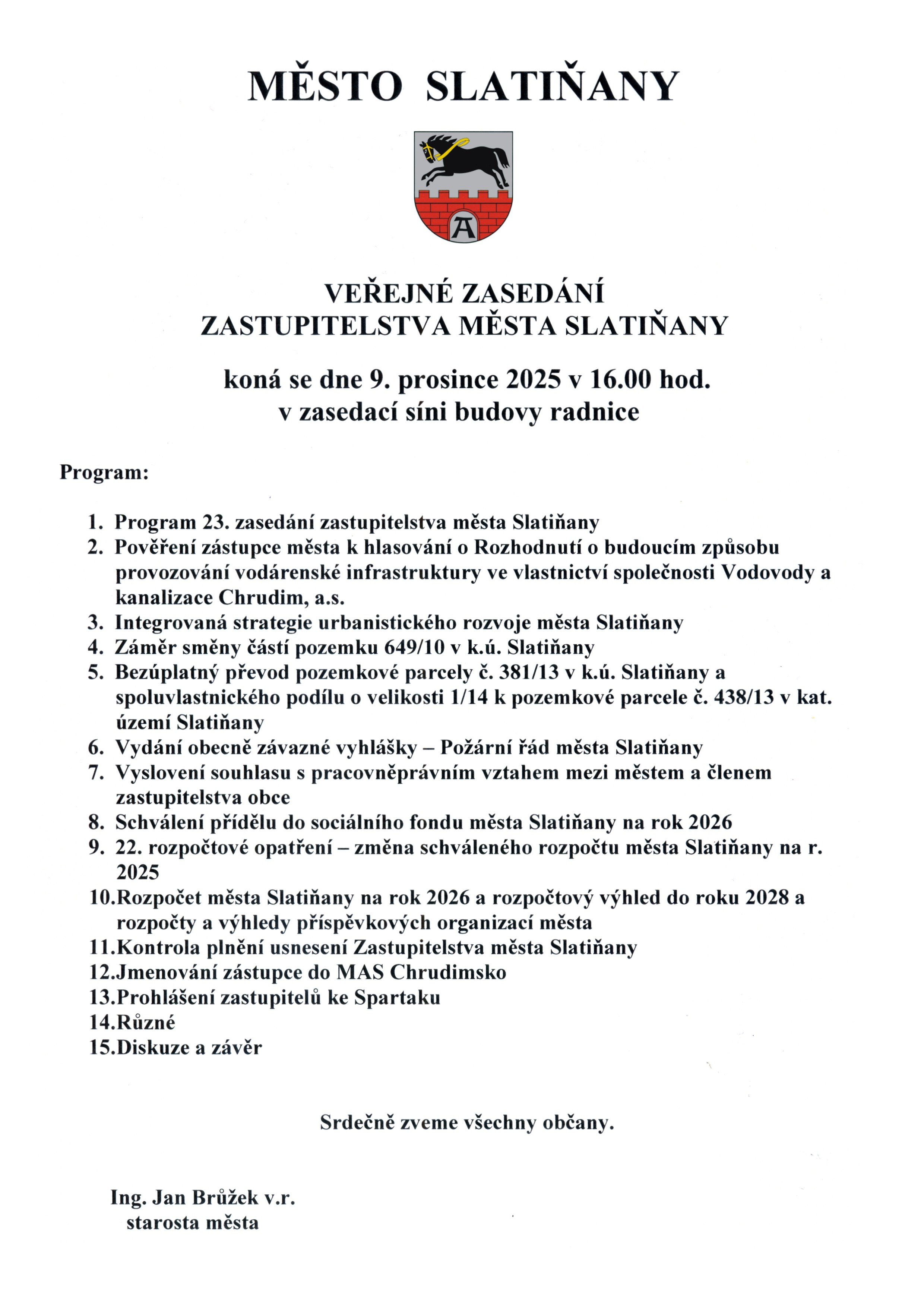 Pozvánka na veřejné zasedání zastupitelstva města Slatiňany dne 9. prosince 2025 v 16:00 hodin v zasedací síni budovy radnice