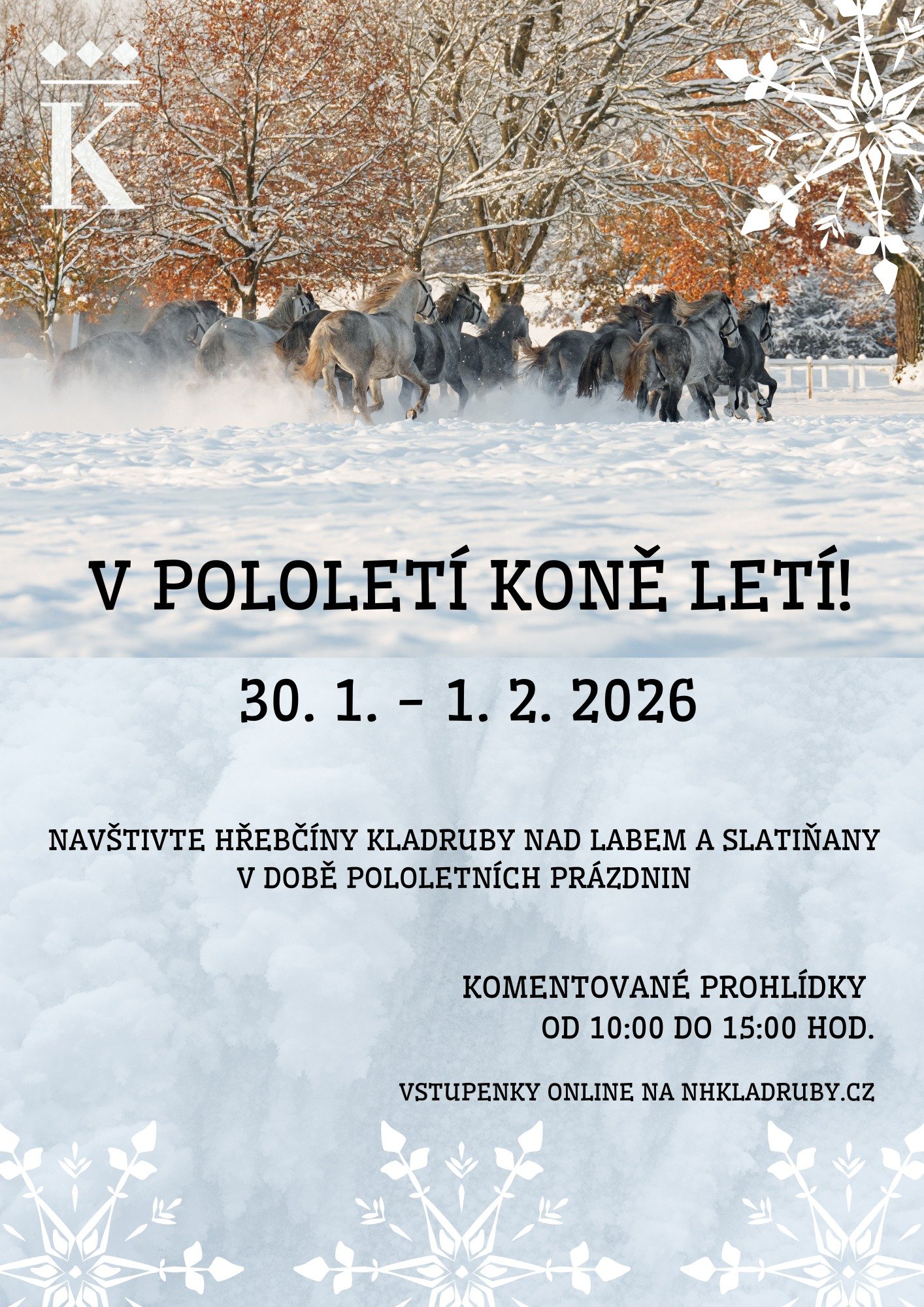 Poznejte krásu starokladrubských koní, nahlédněte do zákulisí hřebčína a užijte si zimní atmosféru na místech s bohatou tradicí. Program je ideální pro rodiny s dětmi i všechny milovníky koní a historie.